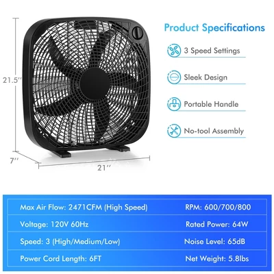 Equipped with a high efficiency motor and 5-blade air supply, this 20-inch box fan can deliver strong airflow while costs very little to run all day. 3 speed settings allow you to select your fan speed easily by rotating the knob for optimal comfort and airflow. The built-in carry handle and back recess for power cord storage are designed for added convenience. The high quality pp cover is sturdy and not easy to deform. Besides, the box fan comes with attachable supporting feet for added stability. The compact and lightweight design allows you to easily place the fan anywhere you need cooling. With a sleek appearance, quiet operation, easy maintenance and energy-saving design, this box fan is suitable for various occasions, such as the home, office, dormitory, garage, workshop, etc.