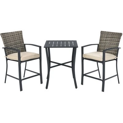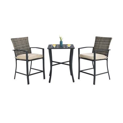 - Hassle-free Assembly: This 3 pieces outdoor furniture includes a coffee table and 2 rattan chairs. All complete accessories and detailed instructions are included in the package, so you can quickly complete the installation task. Dimension of Bar Table:27.5”x 27.5”x 36”(L x W x H), Dimension of Chair: 24.5” x 26”x 45”(L x W x H), Weight Capacity of Bar Table:110lbs,Weight Capacity of Chair: 330lbs