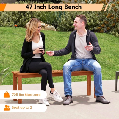 Constructed from premium solid wood with a splinter-free surface and painted with teak oil, our bench with well-designed details promises longevity and minimal maintenance. The large seat comfortably accommodates up to 2 with a maximum load capacity of 705 lbs, perfect for enjoying leisure time with a loved one. The slatted design not only adds to its visual appeal but also increases airflow for more comfortable sitting. Add a touch of natural beauty and practicality to your favorite space with this cozy and nice bench.
