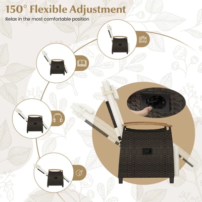 Featuring cozy cushions and headrest, this chair ensures an optimal lounging experience with 150° adjustable backrest and cozy footrest. The elegant mix brown PE rattan, enhanced with curved acacia wood armrest, ensures your recliner remains beautiful through all seasons. Complemented by a foldable side table, this chair is ideal for holding all your essentials within arm’s reach. Elevate your backyard, porch, or poolside with this exquisite, versatile recliner chair, where relaxation meets sophistication.