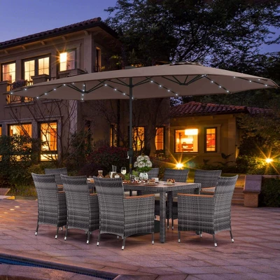 Featuring 8 ergonomically designed rattan chairs and a spacious rectangular table, this outdoor furniture set promises luxurious and versatile dining options. The centerpiece is a majestic 15 ft double-sided patio umbrella, providing expansive shade and equipped with solar-powered lights for an enchanting evening ambiance. Adjusting the umbrella is a breeze with its user-friendly hand-crank mechanism, ensuring quick adaptations to the day’s weather. Plus, the entire patio set ensures lasting beauty and utility, with a matching sturdy base included, enhancing both stability and style. Perfect for any outdoor setting, this all-inclusive patio dining set is a seamless blend of comfort, elegance and practicality, transforming any patio into a desirable retreat.
