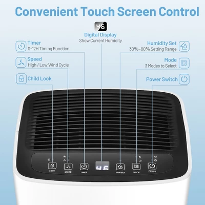 - Intelligent Control & Safety Design: Set the ideal humidity level and it will sense the room humidity intelligently and start dehumidification automatically. Digital display enables current humidity to be read more intuitively and the touch panel makes the operation easier. More, the child-lock function allows you to lock the control panel for safe use.