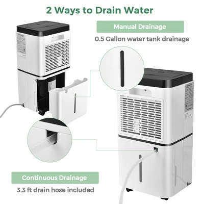 - 2 Drainage Options & Safety Alarm: A 3.3ft long drain hose is provided to be connected to the drainage system to remove water through gravity. And you can also empty the dehumidifier manually by removing the 0.5 gallon water tank. In addition, the full water tank indicator will let you know when you need to empty the water tank.