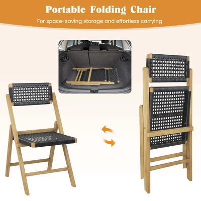 Crafted with premium teak wood, these chairs are sturdy and crack-resistant for long-lasting use. The water-based vanished surface is easy to maintain and adds a touch of sophistication. The woven rope seat and back are both appealing and built to withstand fading. With their quick-folding design, these chairs can be conveniently stored or carried anywhere you desire. The high backrest and ergonomic angle ensure utmost relaxation, while the stable X-shaped structure and reinforced crossbar provide enhanced stability. Experience ultimate outdoor comfort and style with these portable folding chairs.