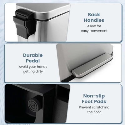 - Hands-free Operation: Thanks to the step-on foot pedal mechanism, the stainless steel garbage bins allow you to discard waste hygienically while keeping your hands clean. And the step-on design grants you access without the need to bend over.