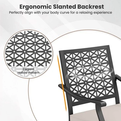 The 360-degree swivel mechanism is the hallmark of the patio chair, offering effortless mobility and convenience. Also, the rocker chair can smoothly rock back and forth, allowing you to unwind in style. Crafted with high-strength metal tube, the outdoor dining chair is enduring, non-deformable and sturdy. Furthermore, the frame’s powder coating and E-coating enhance its durability. The bistro chairs feature thick plush cushion with soft sponge filling, providing a luxurious seating experience. Moreover, the elegant blossom pattern backrest and curved armrests add a touch of sophistication to your outdoor space.