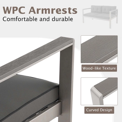 With contemporary look, the patio set fits different decorations perfectly, allowing you to relax with it both outdoors and indoors. More importantly, the outdoor sofa is quite comfortable to sit with armrests in curved design and elastic cushions. And the seat and back cushions can be connected for better fixation. With the useful rectangle coffee table, you can easily fetch food and drinks. And the tabletop with beautiful wood grain is water-resistant, weather-resistant and easy-to-clean. Apart from that, both the loveseat chair and coffee table are of high stability with aluminum structure, which is super sturdy while much lighter than metal. All in all, this outdoor sectional sofa set with appealing look, high-level comfort and long service life is an awesome choice for your daily relaxation.