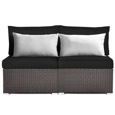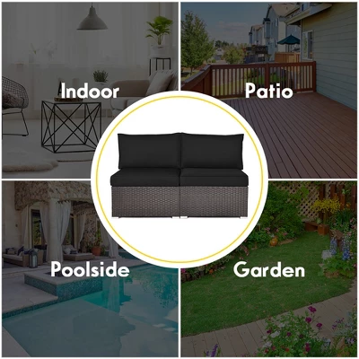 To have a pleasant leisure time outdoors with our wicker armless sofa set. This armless sofa set is stylish and sturdy thanks to the PE rattan and tough steel frame. Two of them can be used separately or matched with other furniture in your outdoor space. And the ergonomic design can bring you comfort as it highly fit your body radian. With thick and soft seat and back cushion, the sofa set will add more comfort to you. And the detachable design with zipper can bring you convenience for cleaning the cushion easily. Plus, the anti-slip aluminum foot pads ensure the stability of the sofa even in wet weather and can protect the floor from scratching.