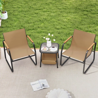 This outdoor conversation bistro set features a stable metal construction supporting up to 400 lbs per chair and is equipped with adjustable foot pads for added stability on uneven surfaces. Relax comfortably on the wide 21” seats, featuring a 105° inclined backrest and plastic wood armrests, all wrapped in breathable, fade-resistant fabric to keep you cool and ensure long-lasting use. Complementing this outdoor patio set is a rustic-style square side table with a wood-like surface and a cleverly integrated storage compartment that can double as a cat condo, making this small patio balcony furniture set as functional as it is stylish.