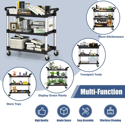 - A Variety of Applications: This multifunctional 3-tier service cart can bring excellent performance in various occasions. Whether cleaning in a restaurant, placing tools in a workshop, or transporting documents in an office, this 3-tier service cart will help you transport multiple items at once effortlessly.