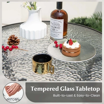 - Durable Tempered Glass: This 38” outdoor bistro table features a sturdy tempered glass tabletop that is built to withstand outdoor conditions. Plus, it is fitted with protective silicon pads between the metal frame and the glass top for safe use.