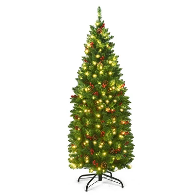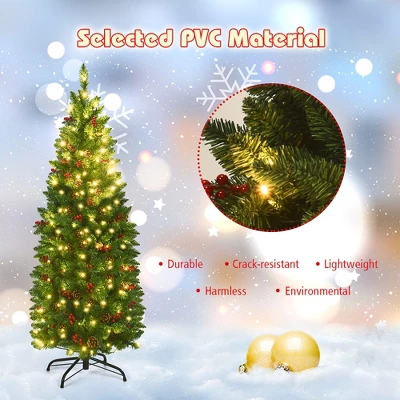Don’t worry about having no space for a Christmas tree. Its slim shape is great for displaying in small room and tight corners with limited space. Lush PVC branch tips with cones and red berries will help to simulate an extremely real Christmas tree. Comes with LED lights and UL certified plug adapter, this tree provides sustainable lighting for the whole holiday. What’s more, hinged design makes assembly easy and quick. It is an attractive addition in party, Halloween, Christmas, etc.