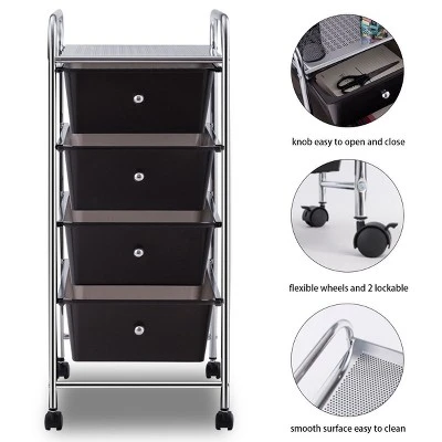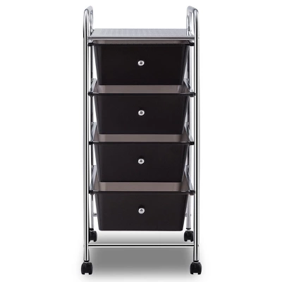 This is our 4- drawer storage trolley cart which offers a stylish solution for organizing and storing your items easily. This versatile cart is constructed from a sturdy chrome plated steel frame and includes 4 sliding drawers and 4 black casters for added mobility. What is more, it has two grip handles for convenient handling. In addition, the metal panel on the top can put things and have a good protection of the drawers. Do not hesitate to buy it now!