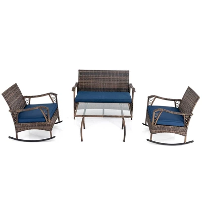 - Perfect Leisure Complement: Designed with attention to detail, this elegant wicker rocking furniture set is an excellent choice for savoring morning coffees, engrossing books, or tranquil evening skies. Dimension of rocking chair: 31.5″ x 26″ x 32″ (L x W x H). Dimension of loveseat: 29″ x 47″ x 32″ (L x W x H). Dimension of coffee table: 36″ x 22″ x 19″ (L x W x H).