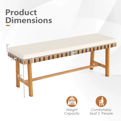 Discover the beauty and versatility of our acacia wood outdoor bench, crafted from high-quality acacia wood for durability and a natural look that adds rustic charm to your space. This bench is not only a stunning addition to any garden, patio, or entryway but also offers functional versatility as it comfortably accommodates 2 people on its large 48″ x 14″ seat. Designed with your comfort and safety in mind, the seat is equipped with thick padded cushions with removable zippered covers for easy cleaning, maintaining both comfort and hygiene. Simple to assemble, this bench integrates effortlessly into various settings both indoors and outdoors. To ensure its longevity and maintain its stylish appearance, regular wood oil (not included) treatment is recommended, along with safeguarding it against prolonged exposure to rain.