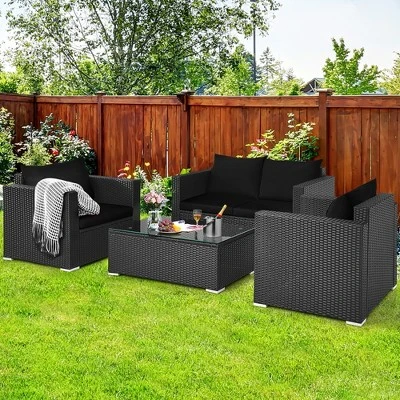 Because of the soft seat and back cushions, this outdoor sofa set can provide you with comfortable sitting experience. Widened armrests relax your arms and provide better support for your body. The frame is made of powder-coated steel and sturdy PE rattan wicker, which is sturdy enough to ensure a long lifespan. Aluminum foot pads at the bottom enhance the stability. Besides, the rattan table is equipped with a tempered glass tabletop, which is convenient for you to placing some drinks and fruits on it. If the cushion gets dirty, you can simply zip off the cushion cover and wash it.