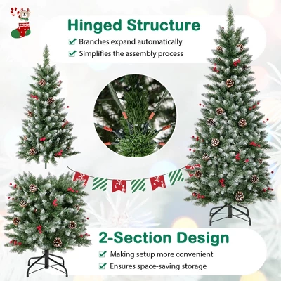 - Vibrant & Snowy Design: The 5 ft Xmas tree features 408 snowy, lush branch tips with a lovely bullet-shaped design. Crafted with detail, the tree comes with 24 vivid, natural pine cones and 23 clusters of lovely red berries.