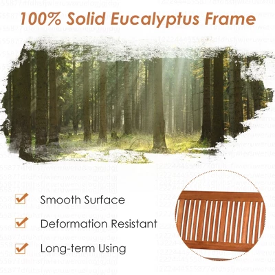 - 100% Solid Wood Frame: Made of natural and premium eucalyptus, this outdoor bench is not easy to be affected by humidity change and lead to crack. The surface of the bench is painted with varnish which ensures the function of waterproof and scratch resistant.