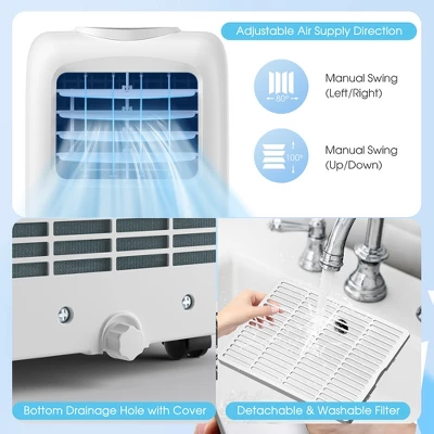 This ASHARE 8000 BTU (5000 BTU DOE SACC standard) air conditioner with adjustable wind direction can achieve fast cooling in a wide area. It works well anywhere that needs coolness, such as home, office, garage, dormitory, etc. In addition to being used for cooling, this AC unit also has fan and dehumidification functions to meet various needs. With the intelligent touch panel and easy-to-read digital display, you can change and check the settings with ease. And there is a remote control for you to control the air conditioner without getting up from the couch or bed. The 24H timer and low-noise sleep mode allow you to set the auto off time and enjoy a peaceful sleep. Moreover, 4 wheels make it easy to move around and the detachable & washable filter ensures easy cleaning.