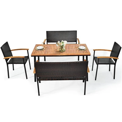 Outdoor dining set includes 1 wood table, 2 rattan chairs and 2 rattan benches