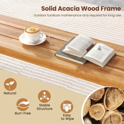- Solid Acacia Wood Frame: Crafted with a high-quality, burr-free solid acacia wood frame, this outdoor garden bench ensures a natural and attractive look that complements any garden or patio setting. The material not only merges seamlessly with outdoor decor but also offers a robust structure that’s easy to maintain with wood wax oil regularly.