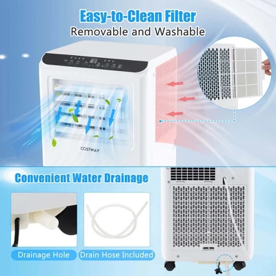 With cool, dehumidify, and fan modes, as well as sleep mode, this AC unit ensures you stay comfortable day and night. You will experience quick cooling with the 10000 BTU capacity, suitable for rooms up to 350 sq.ft. Besides, you can enjoy dual control options with the LED touch panel and remote control for convenient adjustments. Featuring 2 handles and 4 universal wheels, this portable AC offers effortless mobility around your home. Setup is simple with the included window kit and instructions.