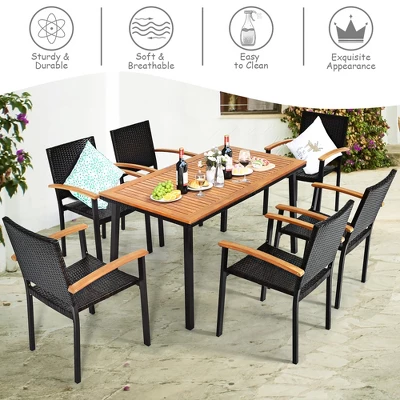 Our 7pcs dining table set features 1 rectangular acacia top table and 6 rattan chairs.Constructed from a sturdy powder coated steel frame and all-weather PE rattan, this dining set is stable and sturdy enough to support long lasting use. Besides, featuring sturdy acacia armrests and ergonomic backrest, the rattan chair can provide you with great support and comfort. And there is an umbrella hole on the table, which allows you to place an umbrella to block the dazzling sunlight. Moreover, the stylish and simple design is perfect for your garden, yard, poolside and so on.