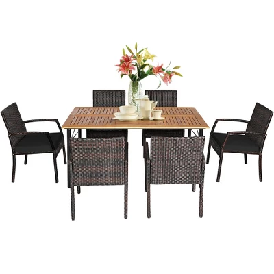 Please use our 7-piece dining table set to enjoy a relaxing outdoor meal with your family or guests. This amazing dining set includes a dining table and 6 armchairs. Made of high-quality PE rattan and powder-coating steel frame, the set is sturdy and weather-resistant. The spacious acacia wood tabletop provides plenty of space for you to prepare hearty dishes or drinks. What’s more, it can be used with an umbrella, so you still can enjoy your outdoor time in a hot day or rainy day. 6 ergonomic armchairs are equipped with soft cushions to relieve your fatigue, so that you will not be tired after sitting for a long time. This patio dining furniture set is a good choice to your backyard, balcony, patio, etc. Do not miss it!