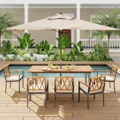 Coming with a large slatted tabletop crafted with natural acacia wood, this outdoor table seats 8 people comfortably. Ideal for various settings like yards, patios, or home use, the large wood table promises easy maintenance due to the waterproof surface. Moreover, it’s also worth mentioning that an umbrella hole can suit most umbrella sizes to provide coolness on hot days, and a hole cover included offers a flat tabletop for meals. Plus, each supporting leg made of sturdy metal is equipped with an adjustable foot pad for added stability, with a maximum weight capacity of 330 lbs.