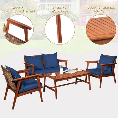 Do you want to have a private corner in your garden or patio? Our 4-piece furniture set is a good choice for you. The frame of set is made of premium solid wood and rattan, which ensures incredible durability and offers a beautifully textured look for long time. All the single chairs and loveseat are equipped with soft and high-resilient cushion for seat and backrest. You will get excellent comfort if you sit on the sofa. With hidden zipper, the covers of seat and back cushion are easy to be taken off and washed if it gets stained or dirty. And the set can be placed both in outdoor and indoor to be a good décor.