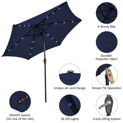 - Energy-efficient Lighting: With a total of 18 built-in LED lights (3 on each rib), this outdoor umbrella can provide perfect lighting at night and create a warm atmosphere. More importantly, these lights are powered by solar panel on the canopy, saving energy in a green and efficient way.