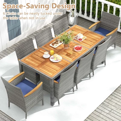 Crafted from fade-resistant mix gray PE rattan and long-lasting acacia wood, the dining set combines beauty and resilience. Ergonomic chairs feature inclined backrests, curved armrests, and soft cushions with zippered, removable covers for easy cleaning. The spacious rectangular table includes a 2″ umbrella hole, fitting most patio umbrellas to keep you shaded during sunny days. The outdoor dining set is supported by a heavy-duty metal frame, and each chair can hold up to 400 lbs, ensuring sturdy comfort for up to 8 guests. For added convenience, 6 chairs can be neatly tucked under the table, saving space when not in use. Perfect for backyards, gardens, or decks, the patio furniture set invites you to dine, relax, and make lasting memories outdoors.