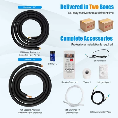 - 2 Boxes Shipment with Installation Kit: This inverter split air conditioner will be delivered in 2 boxes with the installation kit and instruction. Please be patient if you only receive 1 of them. Note: the installation of this product should be done only by a licensed electrician or a HVAC technician.