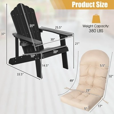 Made of selected HIPS material, our Adirondack chairs are less likely to fade, peel, crack and can withstand all kinds of outdoor weather than wooden chairs, committed to accompany you for a longer time. The wide backrest and armrests can relieve the pressure on your back and arms. With top-grade PP cotton and sturdy polyester cover, the seat cushion features long-lasting service life and brings you optimal comfort. In addition, the 105° slightly inclined angle between the backrest and the seat is ergonomically designed to reduce your fatigue and helps you relax. Besides, it is equipped with a removable hidden cup holders for you to keep your drinks at your side. And the components of the chair are reinforced by 304 stainless steel screws to ensure the overall stability. Relax with more comfort with our Adirondack chair & cushion set!