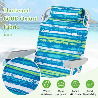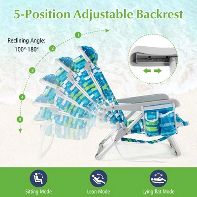 - Ultimate Comfort & Ergonomic Design: The beach chair boasts a 5-position adjustable backrest, thus you can comfortably sit upright, lay back, or lay flat. Moreover, it adopts a 19.5” wide seat, curved armrests, and a comfy padded pillow, allowing for ultimate relaxation during extended beach stays.