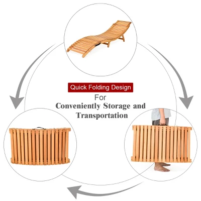 This is our folding Eucalyptus lounge chair which is composed of solid wood structure and comfortable sponge cushion. The chaise chair is tightly screwed, which provides you with satisfactory load-bearing capacity and stability. And the weather-resistant characteristic ensures that our lounge chair can withstand the test of outdoor use. Natural wood frame and two-color cushion add unique charm to your outdoor environment. It’s worth mentioning that our lounge chair can be quickly folded when not in use for easy storage. Featuring with a thickened handle, you can carry this chair to different places. The lounge chair is an ideal choice for poolside, patio, porch and seaside.
