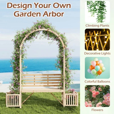 Are you looking for a versatile garden arbor that combines both aesthetics and functionality? Our arc top bench trellis is the perfect choice for you. With ample planting space, including 6 crossbars on the top and 2 side planting boxes and side climbing trellises, it provides abundant room for your climbing plants to flourish. The 2-seat wooden bench offers a wide seat and a comfortable backrest, supporting up to 660 lbs, making this wooden bench arbor arch an ideal spot for you to unwind with a good book or chat with friends. Additionally, you can also enjoy multiple decorating options, such as wrapping decorative lights, displaying colorful balloons and flowers, to create a perfect backdrop for outdoor events, like backyards, patios, or community gardens.
