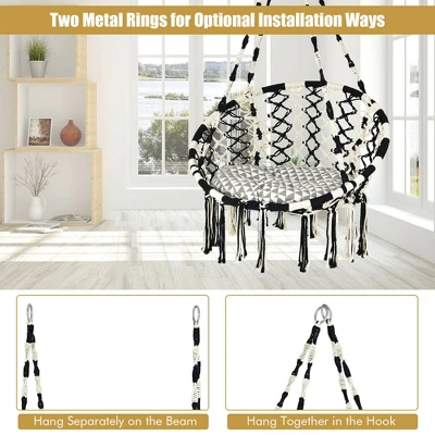 If you are looking for a hammock chair to decorate your home, then this one is a good choice for you!By using two metal hoops, you can hang this hammock chair wherever you want to add a tasteful bohemian touch and create a cozy zone indoors and outdoors. Supported by heavy-duty steel frame and strong cotton ropes, our hammock chair comes with strong weight capacity up to 330 lbs, ensuring great security and stability. Two rustproof hoops are designed for alternative installation methods and quick setting-up. Hope our hammock chair will brighten up your home and relieve your fatigue after a long work day.