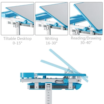 Our multi-functional kids study desk and chair set combines practicality & fun, which is an ideal study companion for your kids. The height of the desk and chair is adjustable in order to have a perfect posture when sitting.Tilted tabletop satisfies different needs of reading, writing or drawing. The organized pull out drawer can maintain stationery with different classifications. Made of premium environmentally friendly materials, this set is sturdy yet safe. The pedestal frames feature anti-slippery floor glides that prevents itself from moving.