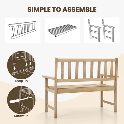 - Seat up to 2 People: Engineered to support up to 440 lbs, this patio garden bench can comfortably accommodate 2 adults while the 45″ x 20.5″ seating area provides sufficient space.^ Comfort Meets Style: Designed for relaxation, this 2-person porch bench features a gracefully curved backrest and a slatted seat to provide the perfect spot for unwinding and enhance the aesthetic appeal.^ Versatile & Classic Design: The warm tones of teak wood and the classic design blend seamlessly with any outdoor decoration, whether it’s a cozy corner in your garden or an inviting addition to your porch.^ Simple to Assemble: This outdoor loveseat chair is convenient to assemble. All you need to do is snap in and screw in to connect each part. Overall dimension: 47″ x 25.5″ x 36″ (L x W x H).^