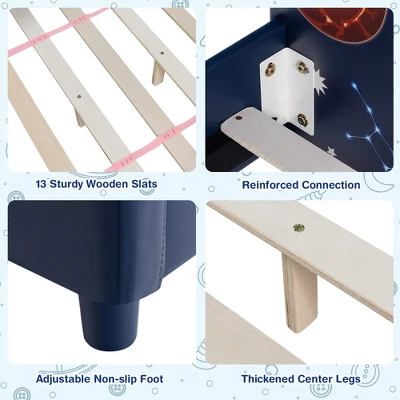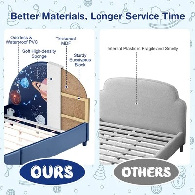 - Fix the Mattress (Not Included) in Place: Designed with headboard, side rails and footboard, this kids bed frame effectively prevents the mattress (not included) from accidentally falling. Besides, the soft sponge padded headboard and kid-friendly bed height allow your children to get on the bed easily and lean back comfortably to read a book.