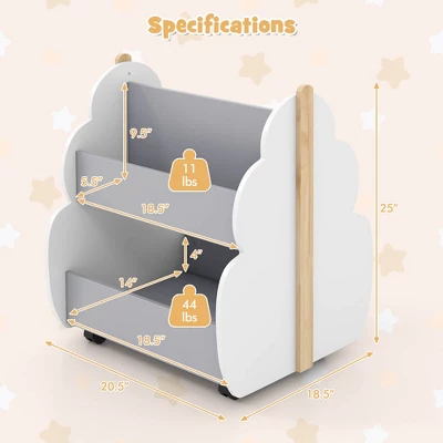 - Double-sided Open Storage Design: The double-sided storage design of this 2-tier bookshelf provides larger storage space and makes it easier for kids to see and find out what toys or books they want. It also has a strong display function as children can put their paintings, books, photos, or crafts on the shelf for displaying.