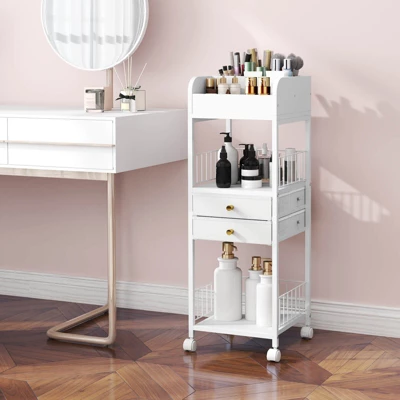 - Large Storage Capacity: The rolling storage organizer features 2 open shelves and 2 accessible drawers, helping clear your countertop and streamline your beauty essentials. Besides, the roomy top with removable divider brings customizable storage.