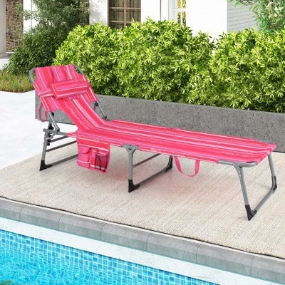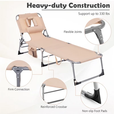 Made of high quality oxford fabric, our lounge chair is sturdy enough to stand the test of time. Besides, the premium steel frame is resistant to high temperatures and rust, so that you can use this beach chair both indoors and outdoors. With high load-bearing capacity up to 330 lbs, you can use this chair without worrying about deformation. In addition, the breathable fabric and ergonomic pillow offer a soft and comfortable sitting experience. The face cavity with 2 arm slots allows you to watch a cell phone or read a book as you like. Additionally, the installation-free design greatly saves your time and energy. 5 adjustable positions meet your different needs, just enjoy your leisure time with this multifunctional beach chair!
