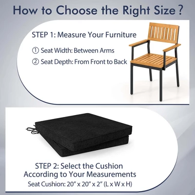 The cushion size is 20″ x 20″ x 2″ (L x W x H), please measure the seat depth and width of your furniture before purchase