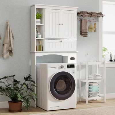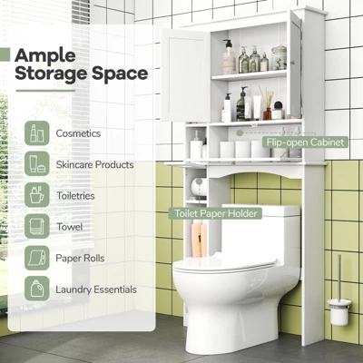 - Ample Storage Space: Our over the toilet cabinet includes 5 open shelves, a flip-open cabinet, and a larger cabinet with 2 doors, providing generous storage for all your toiletries and laundry essentials. Plus, there’ a toilet paper holder for keeping your paper roll easily accessible.