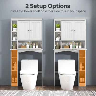 Tired of bathroom clutter? Our space-saving cabinet fits perfectly over your toilet without taking up much of your bathroom space. Choose between 2 setup options to match your room layout, 3 shelf heights for tallest bottles, and 3 bottom bar positions to fit over your pipes. With 5 open shelves, a drop-open cabinet, a dual-door storage, plus a built-in toilet paper holder, every item will find its place. Worried about stability? We’ve included anti-toppling devices to keep your things secure. Upgrade your routine with our over the toilet cabinet!