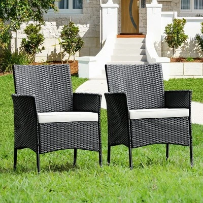 Bring you comfortable enjoyment with your friend or family with these 2/4 piece outdoor rattan chairs! With widened backrest, curved armrests and comfortable seat cushions, these patio dining chairs allow you to enjoy the comfort of its ergonomic shape. Besides, the covers of these seat cushions are waterproof and removable. Made of anti-rust steel frame and weather-resistant PE rattan, theses outdoor chairs are durable and stable to hold up to 360 lbs (each chair). At the same time, the anti-slip foot pads protect your floor from scratching while adding extra stability. Thanks to its all weather materials, these rattan chairs are perfect for outdoors, such as poolside, backyard and garden, etc.