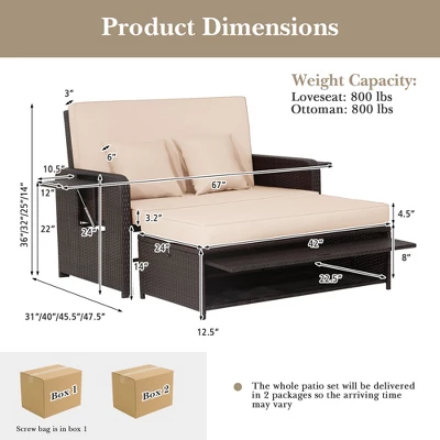 - 2-Package Delivery: This patio rattan daybed set will be delivered in 2 packages which may arrive in different times, so please wait with patience. And the screw bag for the whole set is box 1. What’s more, the assembly is quite easy with the clear instruction. Dimension of loveseat: 31”/40”/45.5”/47.5” x 67” x 36”/32”/25”/14” (L x W x H). Dimension of ottoman: 43.5” x 24” x 12.5” (L x W x H).