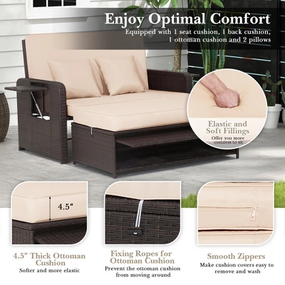 - 2-in-1 Multifunctional Sofa Set: The combination of the loveseat sofa and ottoman allows you to use this patio set as a double chaise lounge / daybed. 4-level adjustable backrest allows you to sit, recline or lie flat for different outdoor activities. And the 2 retractable side trays make drinks and snacks easy to fetch. Moreover, when the ottoman cushion is removed, you can use this patio set as a double sofa with side table.